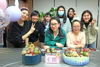 DIY制作完成后,各组成员对自己的作品进行了介绍,演绎出属于自己团队的“主题多肉”。随后,由公司林总、白副总以及嘉宾组成的评审团,对每组绿植作品打分,评选出了一、二、三等奖并为获奖的队伍现场颁奖、合影留念。随后,工会将一盆盆憨态可掬的多肉盆栽送到了各科室,将这份代表着希望的“绿”意延续。