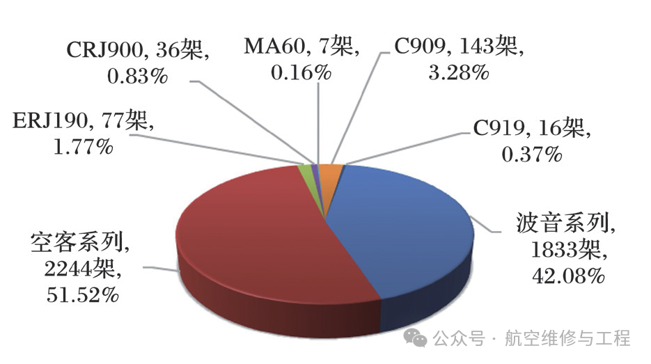 在4356架在用CCAR-121部运行公司机队中,空客机队2244架 (51.52%),波音机队1833架(42.08%),其他ERJ190、CRJ900、MA60、C909和C919机型占国内运输航空器机队的6.40%(见图 1)。