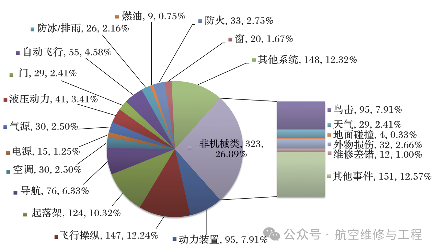 根据航空器使用困难报告系统统计,2024年国内按CCAR-121部运行的航空公司共报告SDR事件1201起,比2023年减少311起,下降20.57%;其中机械类SDR事件878起、非机械类SDR事件323起,分别比2023年减少252起和59起,分别下降22.30%和15.45%。按CCAR-121部运行的航空器空地飞行时间共1390.94万小时,比2023年增长13.43%。SDR千时率、机械类SDR千时率和非机械类SDR千时率分别比2023年降低29.98%、31.50%和25.46%。从图4中可看出2024年度占机械类SDR前三位的是飞行操纵系统(12.24%)、起落架系统(10.32%)和动力装置(7.91%)。