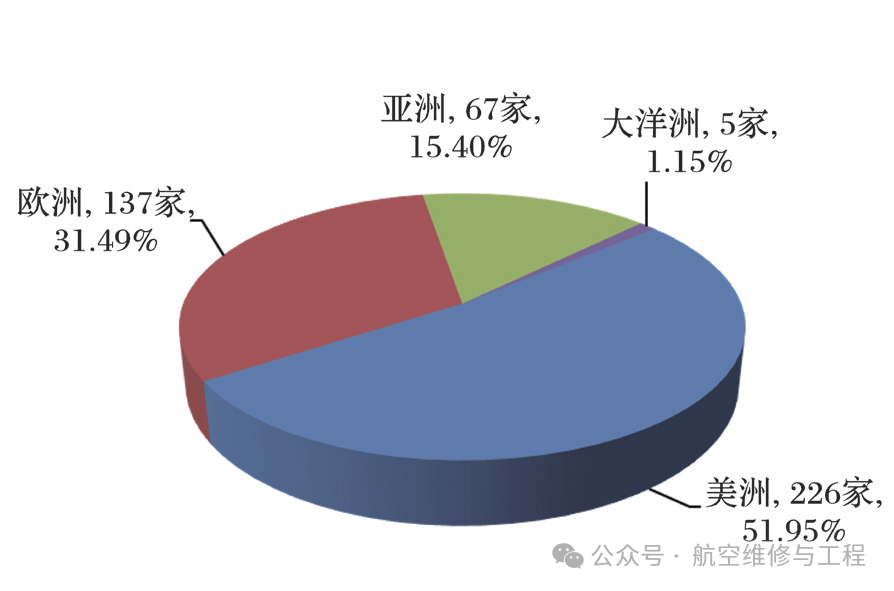 CAAC批准的国外维修单位为435家,其中,美洲地区维修单位数量最多,为226家(51.95%),其次欧洲地区维修单位数量137家(31.49%),亚洲地区维修单位数量67家(15.40%),大洋洲地区维修单位数量5家(1.15%),各地区单位数量如图5所示。