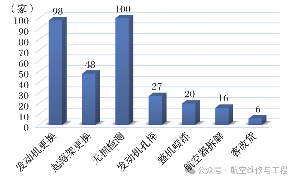 维修单位中,从事发动机更换维修项目有98家,从事起落架更换维修项目有48家,从事无损检测维修项目有100家,从事发动机孔探维修项目有27家,从事整机喷漆维修项目有20家,从事航空器拆解维修项目有16家,从事客改货维修项目有6家,如图8所示。2024年,为适应国家发展飞机拆解产业的需求,民航局颁布了管理文件《航空器 存储管理规范》,规范了飞机长期停场的管理要求。